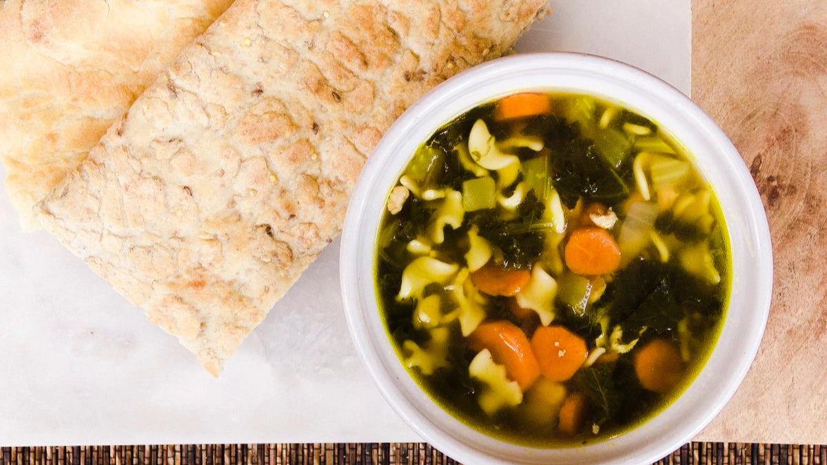 tender slow simmered chicken, sweet carrots, crisp celery, diced onions, al dente mafalda noodles in a handcrafted chicken stock with a pinch of sea salt