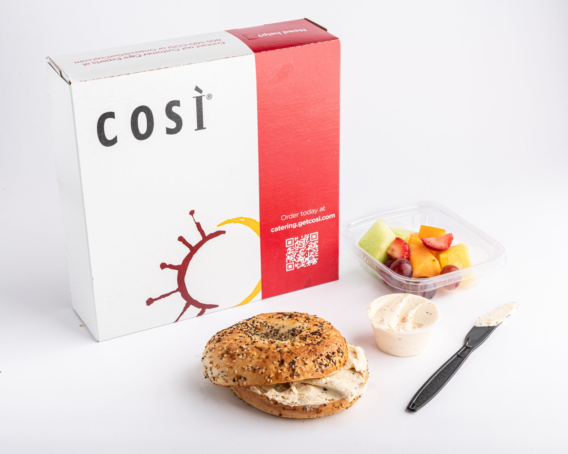 Our breakfast box includes your choice of a bagel, muffin, scone or croissant and a side fruit salad, served with your choice of whipped butter or one cream cheese flavor.