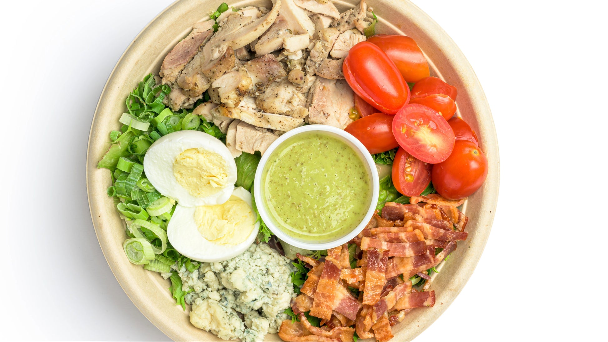 Mixed greens, grape tomatoes, applewood smoked bacon, blue cheese, green onion, hardboiled egg, chicken and green goddess dressing (gluten free)