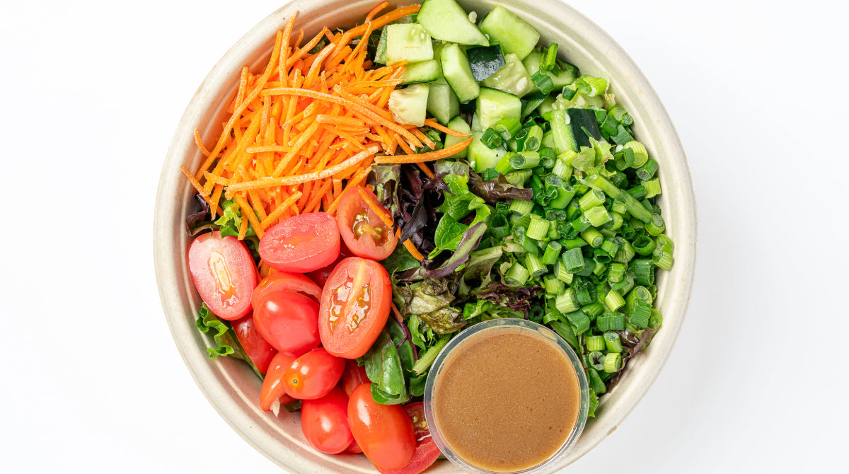 seasonal mixed greens tossed with cherry tomato halves, refreshing cucumber dices, crunchy carrots and savory scallions, served with balsamic vinaigrette (vegan, gluten free)