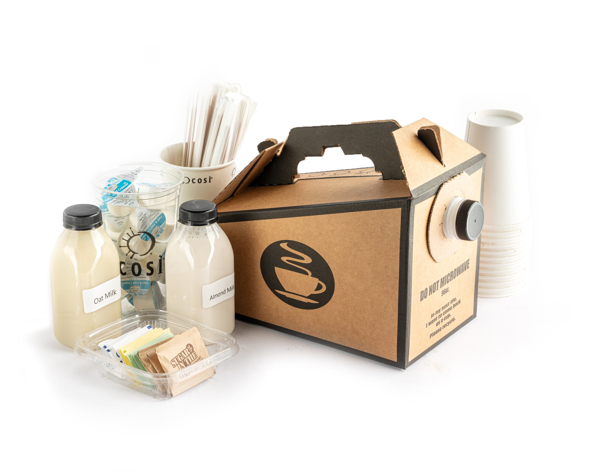 Includes Oat and Almond milk, along with an assortment of sweeteners, including Stevia